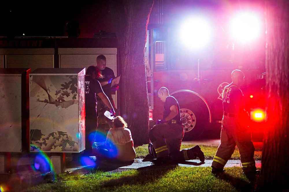 Firefighters and paramedics attend to a victim of a bear spray attack.