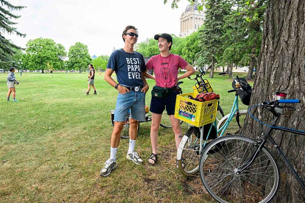 Lee Klimpke (left) and Daria Magnus-Walker wait for riders to meet up on the Manitoba Legislative Grounds for their dad-themed "bike jelly."