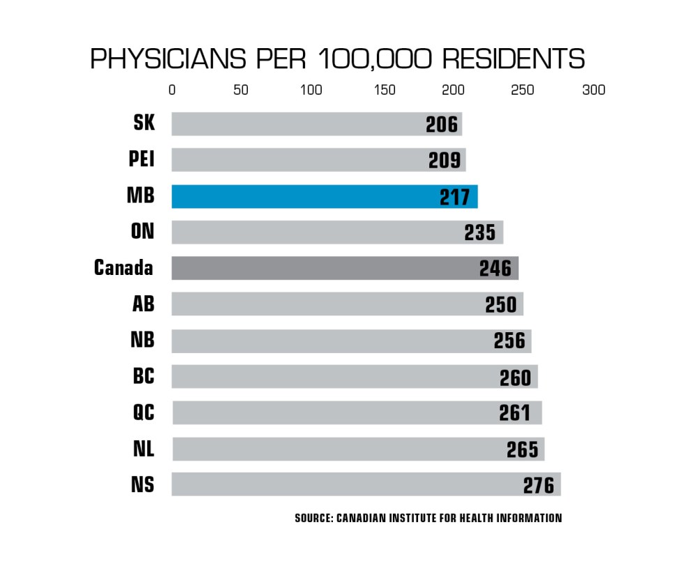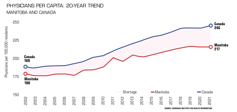 Manitoba is still trying to catch up, and the gap could widen in the short-term. A survey by Doctors Manitoba earlier this year indicated 51 per cent of physicians are planning to retire, leave Manitoba or reduce their hours within three years.