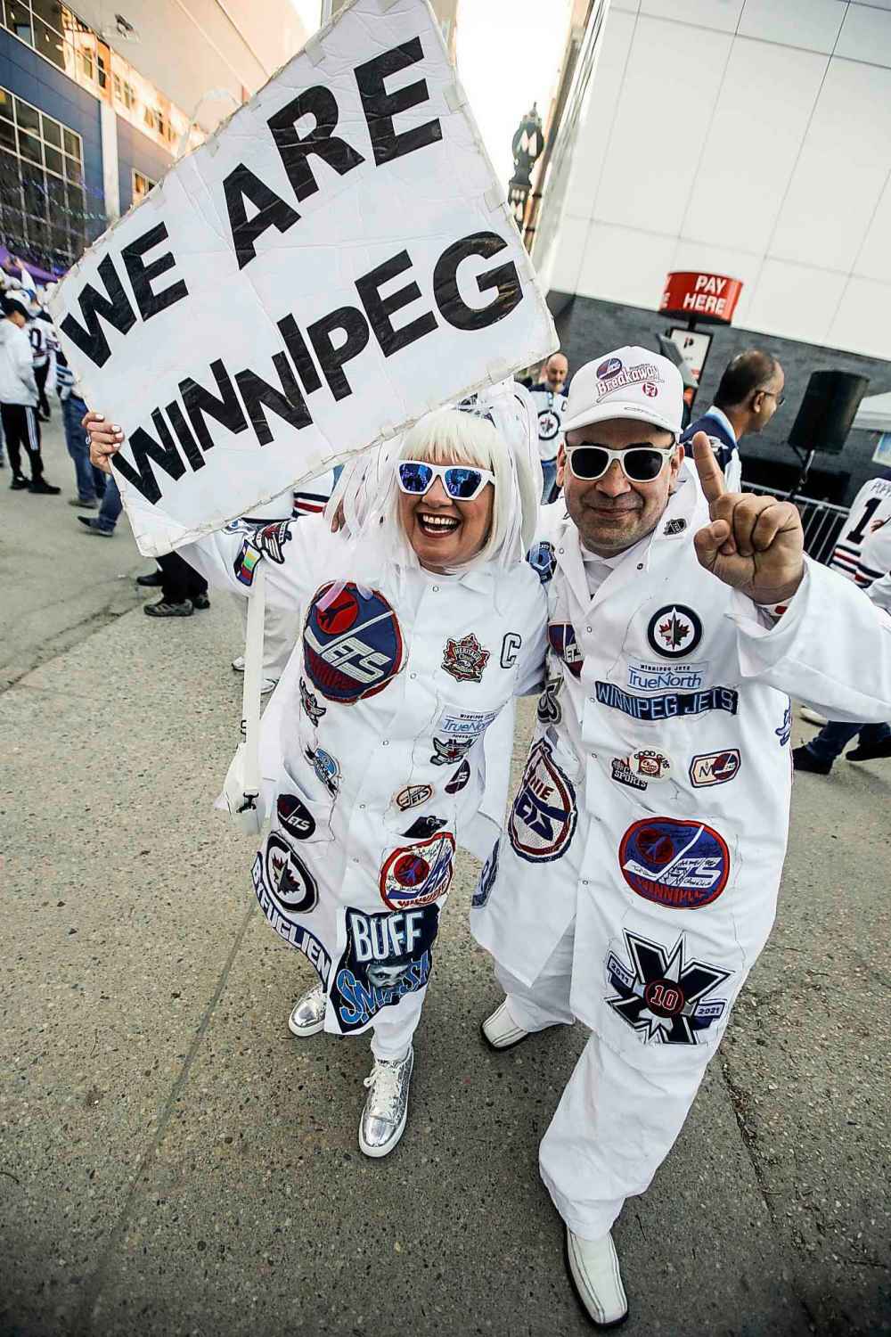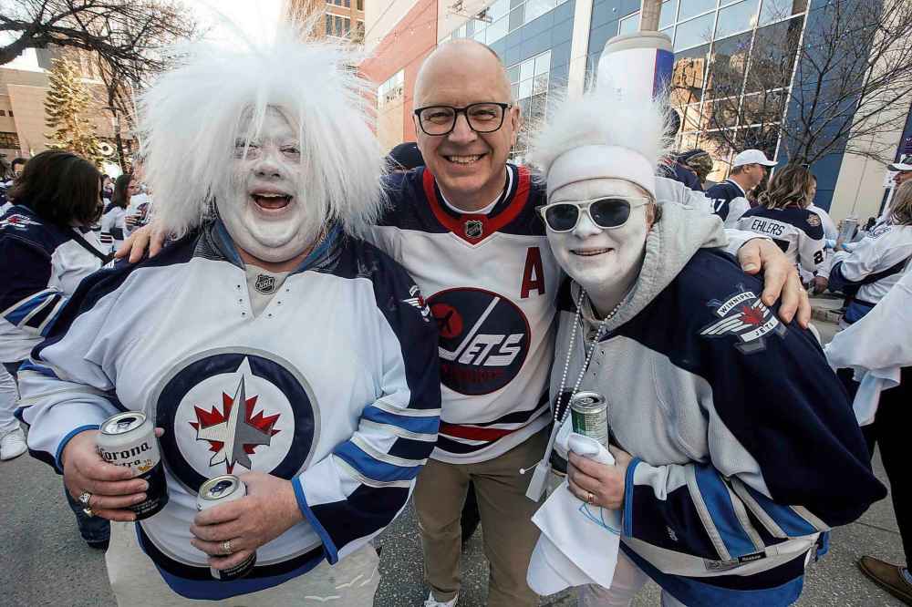Jets fans Ryan and Kristy Nichol with Winnipeg Mayor Scott Gillingham.