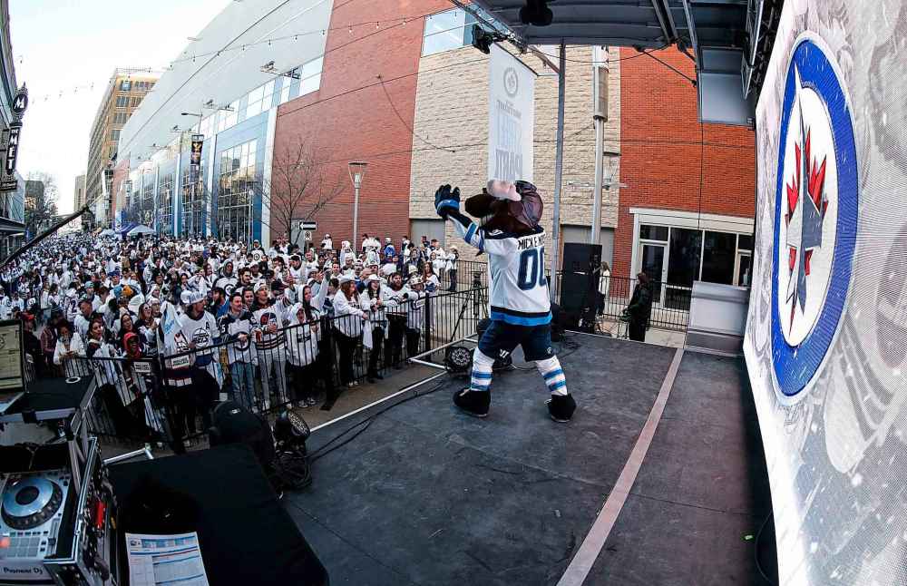 Winnipeg Jets mascot Mick E. Moose gets the crowd going at the Whiteout party on Donald Street on Tuesday evening.