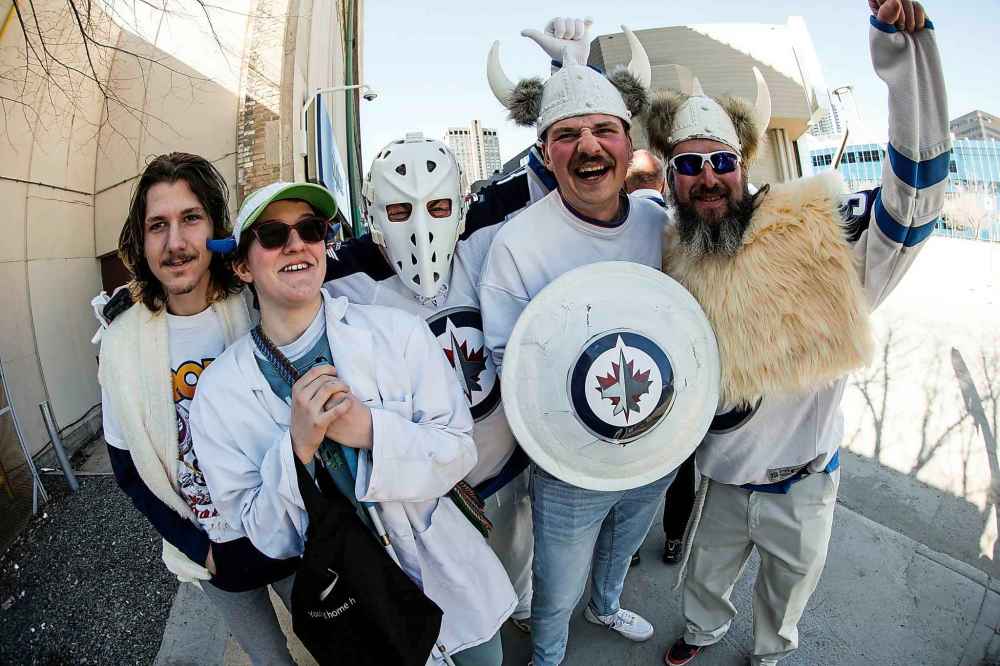 Jets fans Kaee, Ainsley, Blaine, Thomas, and Kerrin at the Winnipeg Jets Whiteout party on Donald Street Sunday.