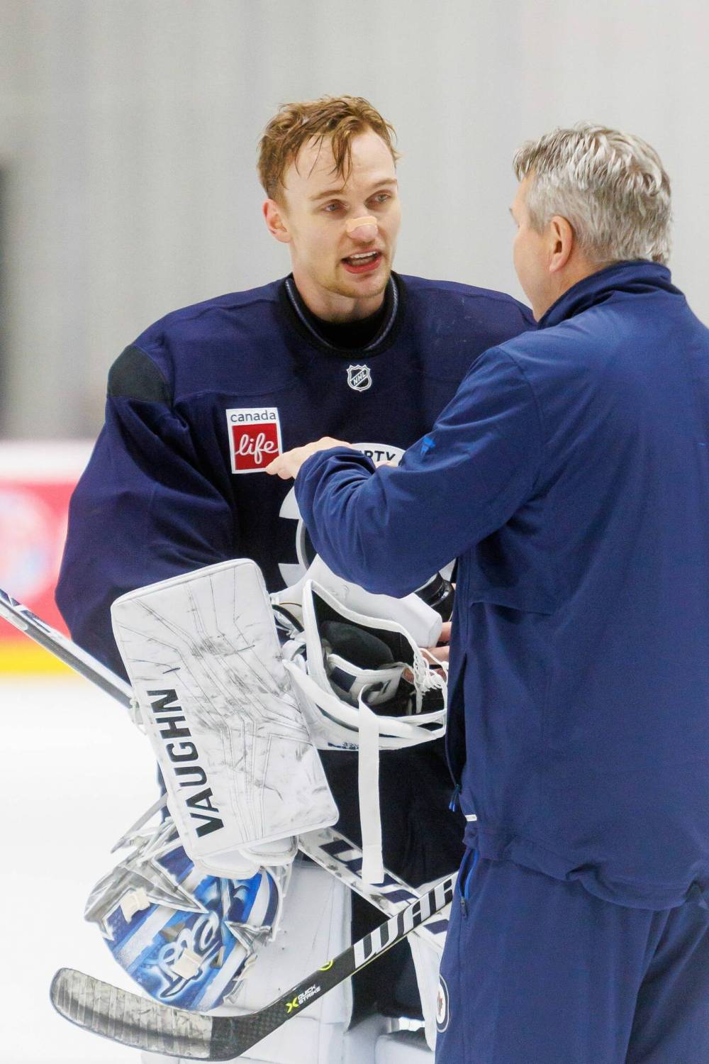 Winnipeg Jets goaltenders Eric Comrie and Kaapo Kähkönen talk to a coach during their NHL training camp practice in Winnipeg on Friday.