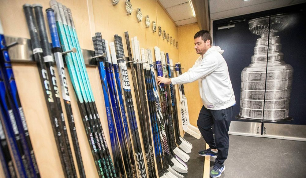 Assistant equipment manager Chase Granger modifies Dylan DeMelo’s stick.