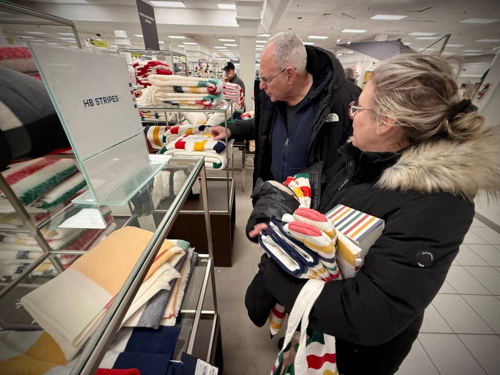 Inside the store, the couple loaded up on pillows, blankets and throws, all adorned with Hudson’s Bay Co. stripes — items that seemed like more than simply merchandise to them.