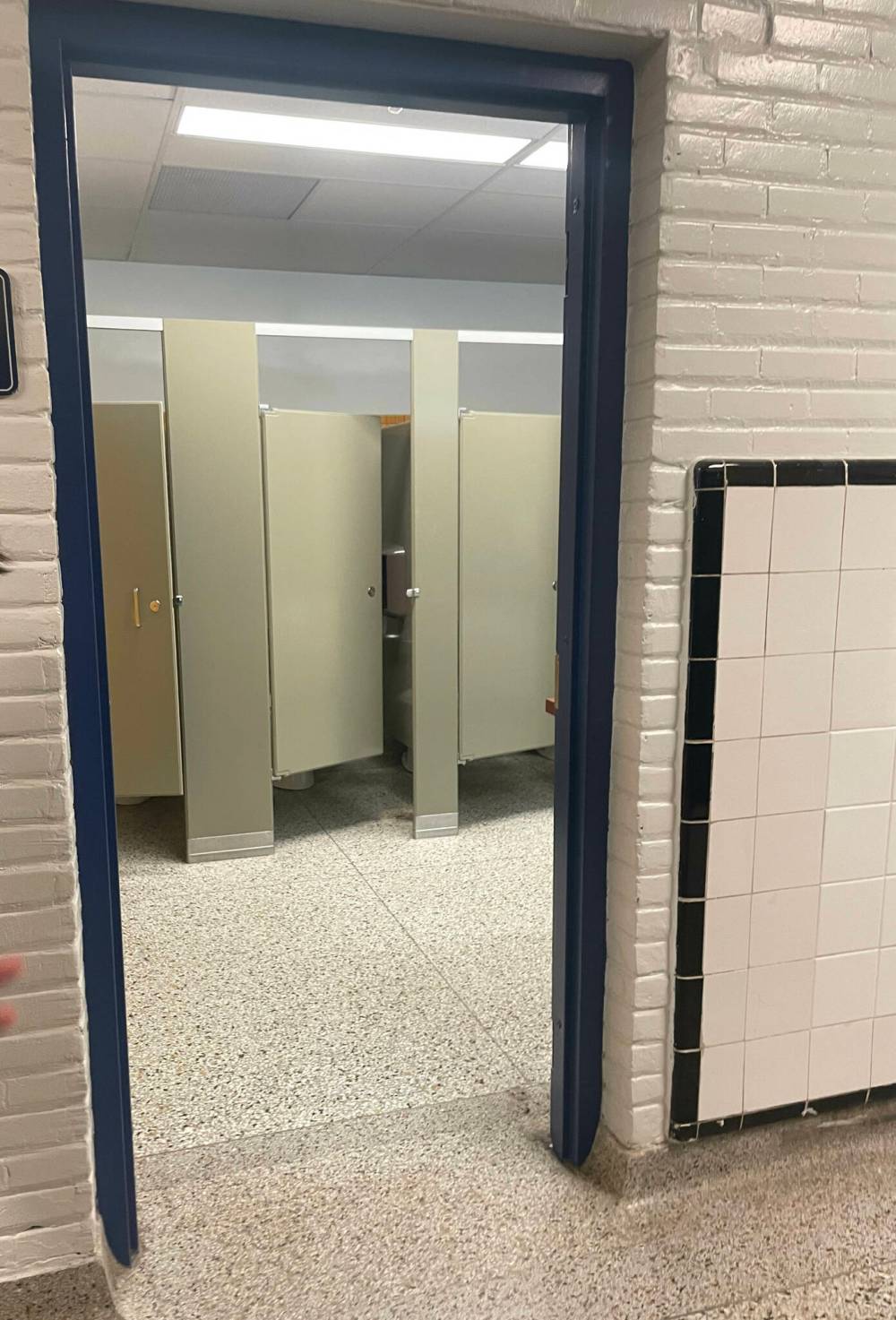 Photos posted on social media showed a clear line of sight from the hallway into the washroom, where passersby could easily see stalls (that still had doors) and anyone else lingering inside.
