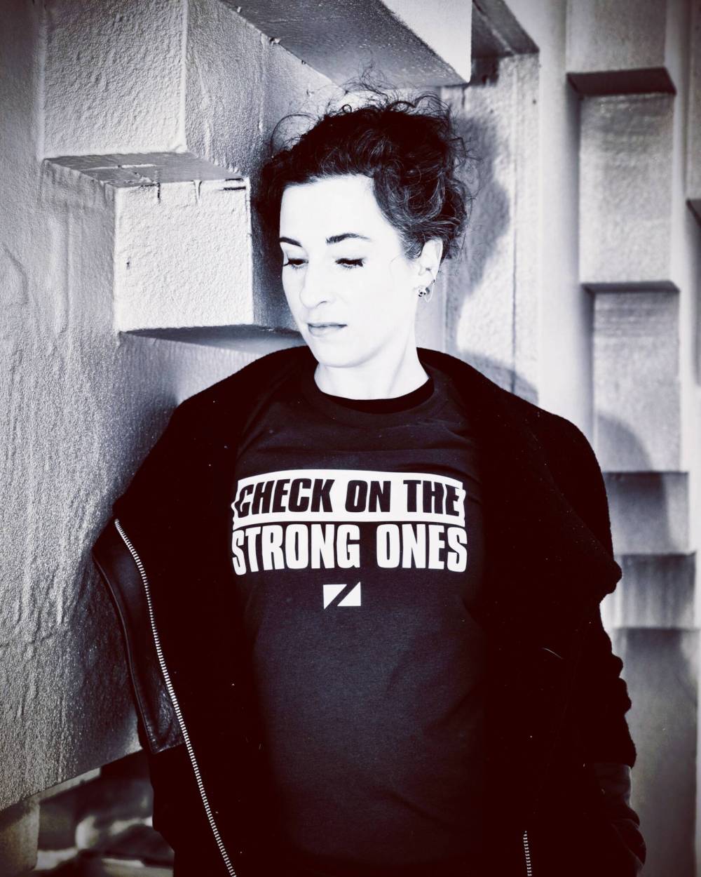 Stacia Franz wears the “Check on the strong ones” t-shirt that she had made in partnership with locally owned clothing company, Zueike. Proceeds from the sale of the shirt will be donated to mental health initiatives in Manitoba.