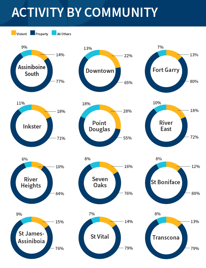 The largest number of criminal incidents occurred on both sides of the Assiniboine River in the West End, accounting for 29.7 per cent of offences committed, ahead of the central area of the city, at 27.2 per cent.