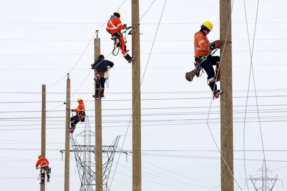 Power line technician trainees practise climbing utility poles to improve their stamina at the Manitoba Hydro facility on Victoria Avenue East on Tuesday.