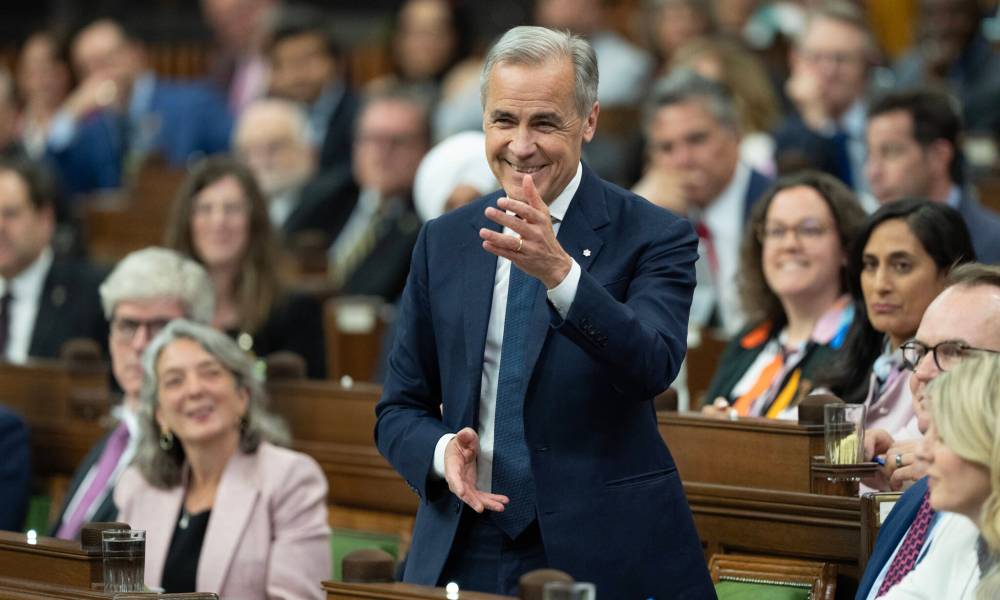Prime Minister Mark Carney smiles as he gestures toward the opposition during question period in the House of Commons.