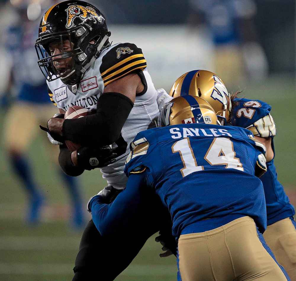 Hamilton Tiger-Cats' Marcus Tucker carries the ball against the Bombers' Marcus Sayles and Jeff Hecht Friday night at IG Field.