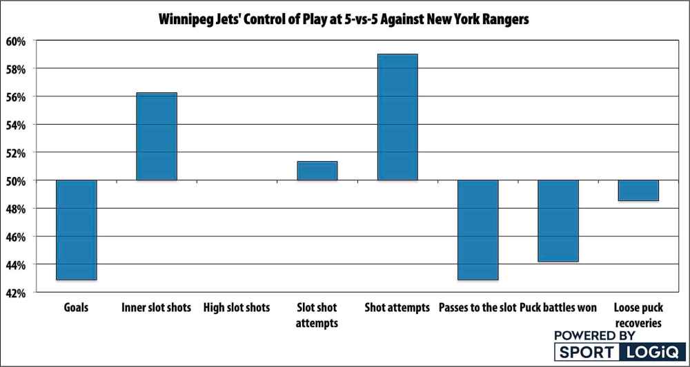 Thanks to outdrawing the Rangers in penalties, the Jets outchanced the Rangers with the man-advantage 8-3, 6-2 in chances on net, and 3-0 in chances from the inner slot or high-danger area.