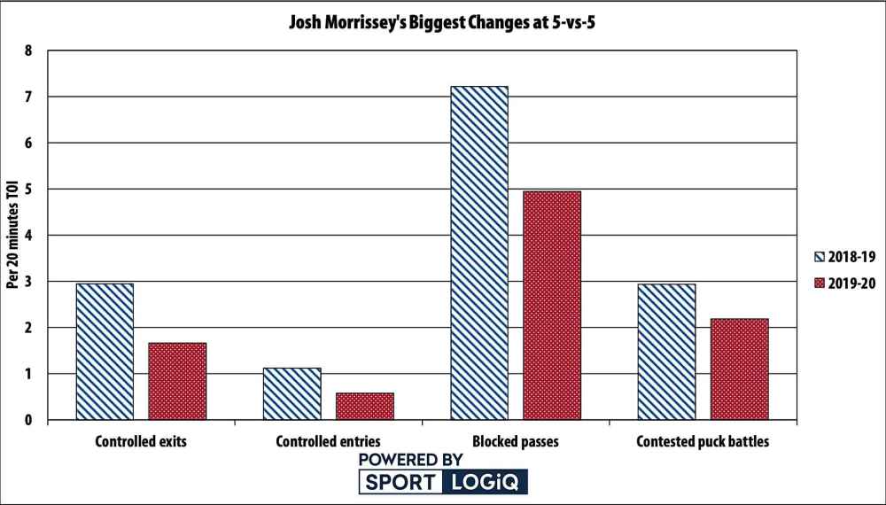 Morrissey’s on-ice differentials are worse in every area. He’s only managed to stem the bleeding a fair amount in terms of slot passes, but the shot-based metrics are rough.