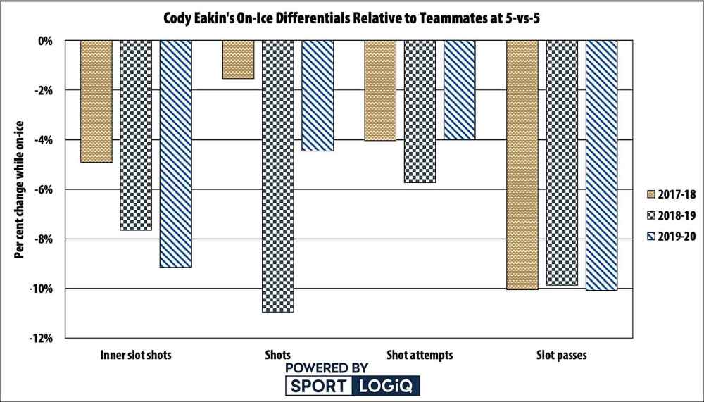 Another area where Eakin could help out his teammates is, despite his lack of point production, on offence. Eakin is involved in creating more scoring chances at even strength than the league average forward, with 6.54 offence-generating plays every 20 minutes being solidly in the top 40 per cent of all NHL forwards and, specifically, his ability to hit a pass to the slot is better than you would expect, with more than one every 20 minutes.