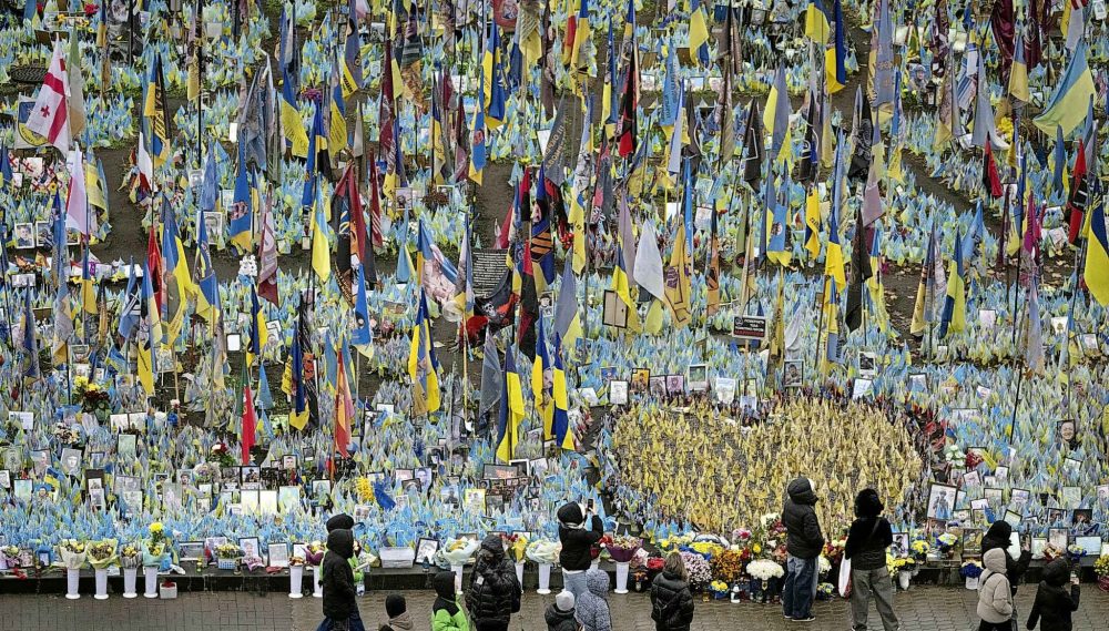 And it fell on Ukraine’s unofficial memorial to the fallen, a yellow-and-blue ocean of flags, flowers and framed photos at Kyiv’s famous Maidan Nezalezhnosti — or Independence Square.