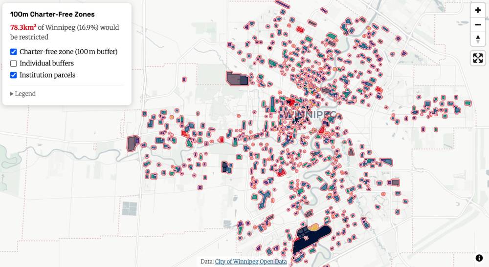 An online map, developed by Buck Doyle and available at chromatin.ca, shows that much of downtown and central Winnipeg would fall into a buffer zone.