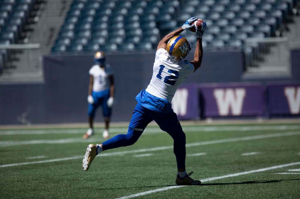 Adarius Bowman snags a pass during a Winnipeg Blue Bombers practice session at Investors Group Field Tuesday.