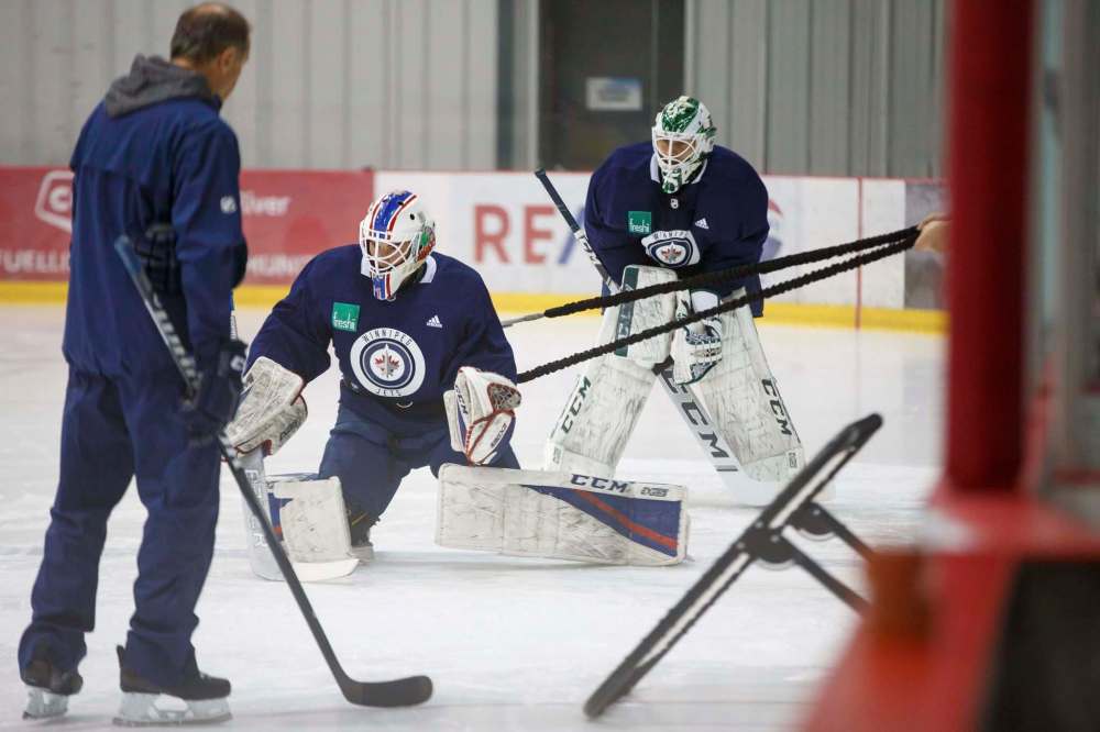 Winnipeg Jets goaltending prospect Arvid Holm (right) watches Logan Neaton work on a drill during development camp on Monday morning.