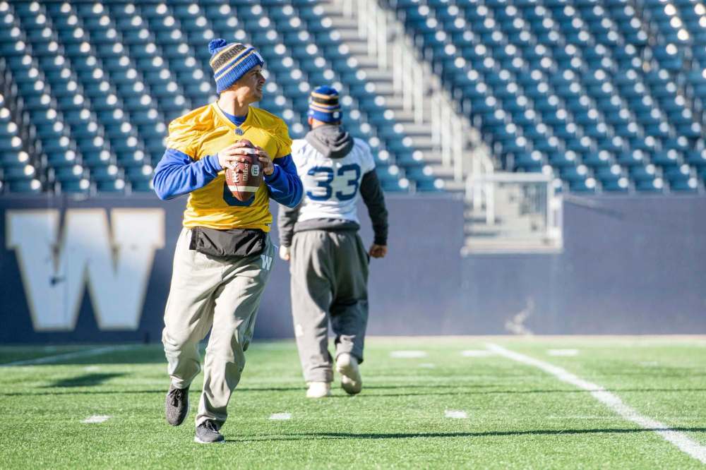 Winnipeg Blue Bombers quarterback Zach Collaros looks for a receiver during practice Thursday morning at IG Field.