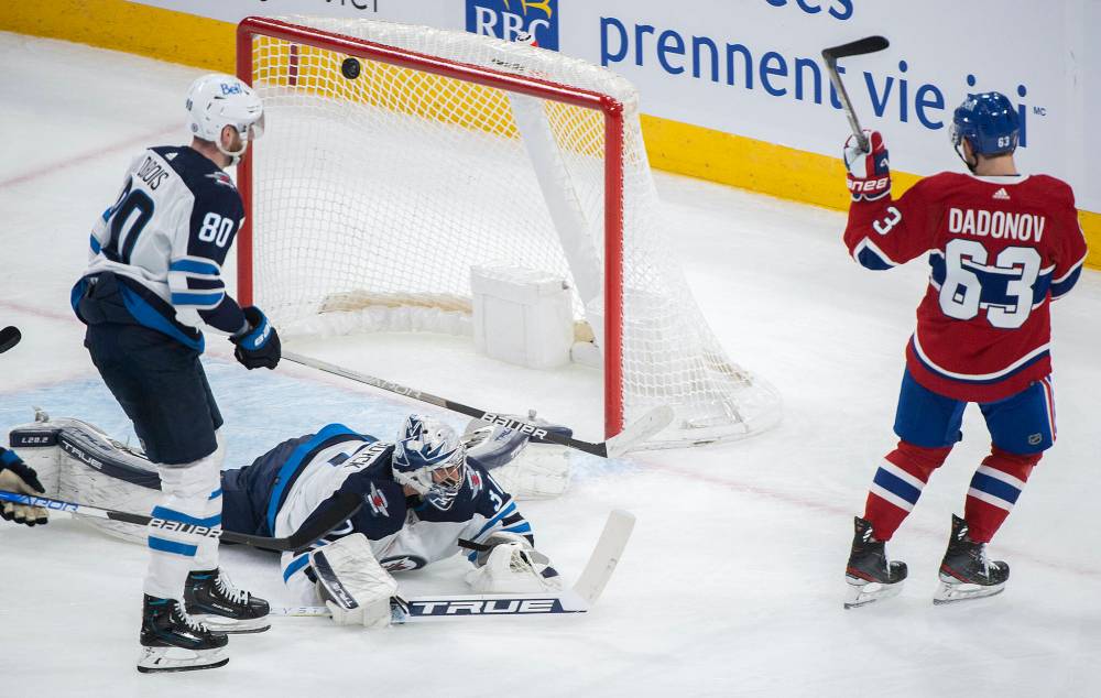 Canadiens’ Evgenii Dadonov scores against Connor Hellebuyck Tuesday in the Jets’ 4-1 loss to the Habs. Head coach Rick Bowness hasn’t been happy with this team’s performance recently.