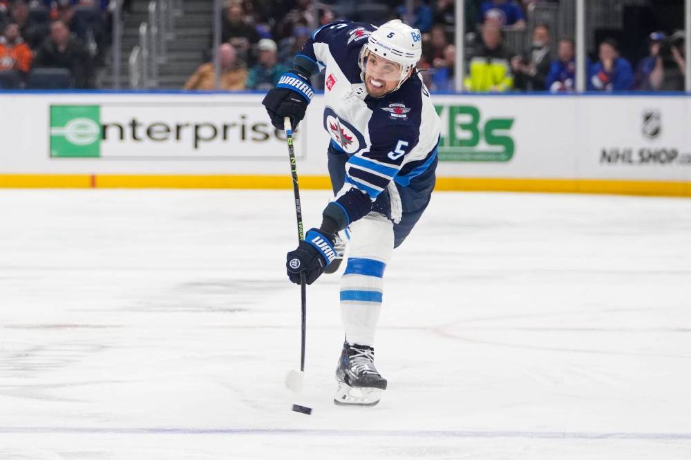 Winnipeg Jets’ Brenden Dillon (5) shoots the puck during the third period of an NHL hockey game against the New York Islanders Wednesday, Feb. 22, 2023, in Elmont, N.Y. The Islanders won 2-1. (AP Photo/Frank Franklin II)