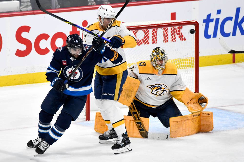 Fred Greenslade / THE CANADIAN PRESS A Josh Morrissey shot finds the back of the net Tuesday during the first period against Nashville Predators goaltender Juuse Saros.