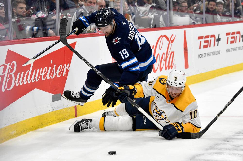 Fred Greenslade / THE CANADIAN PRESS Nashville’s Colton Sissons trips up the Jets’ David Gustafsson on Tuesday during second-period action.
