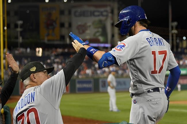 Chicago’s Kris Bryant was 0 for 4 and reached on a fielder’s choice, ending his streak of reaching base safely at 26 games, and Javier Baez ended his hitting streak at 15 games.