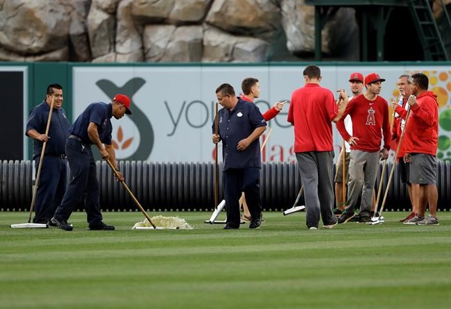 It rained at Angel Stadium two hours before Wednesday’s game, causing puddles to form in both left and right field. The grounds crew worked for over an hour to remove water from the outfield, but conditions remained unplayable.