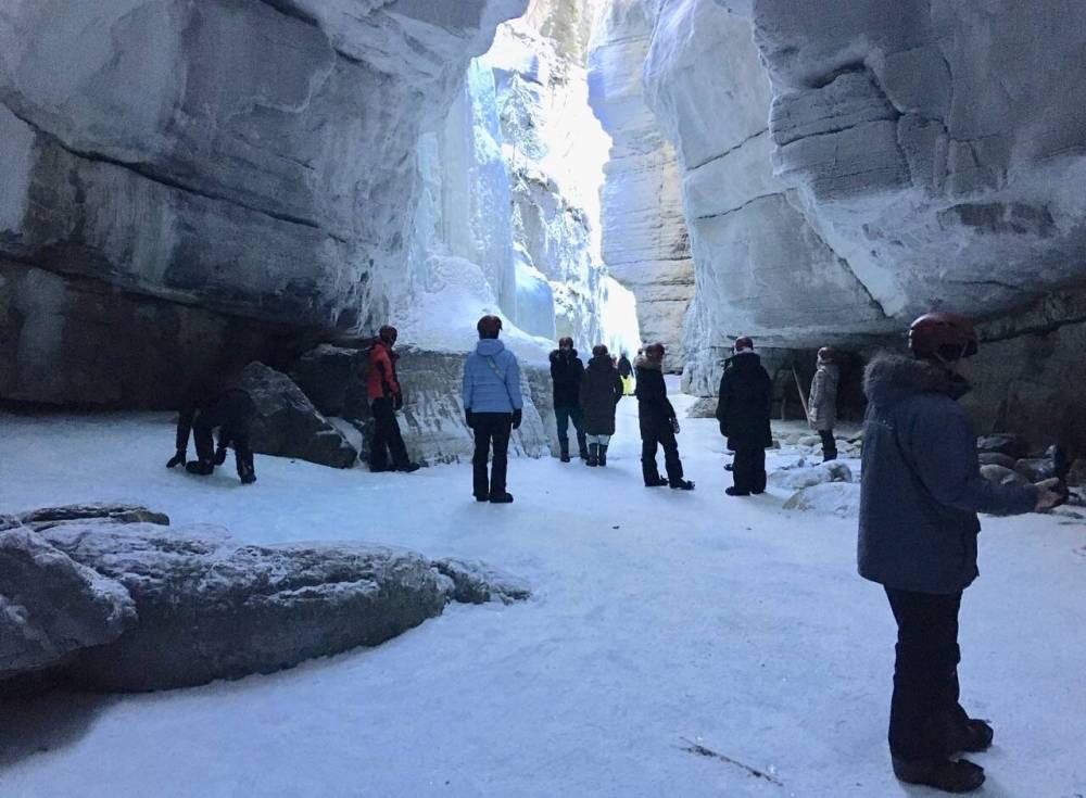 ‘The Corkscrew’s really slippy! And it gets really tight,” warned Scottish guide, Iona, on Maligne Canyon’s Icewalk at Jasper.